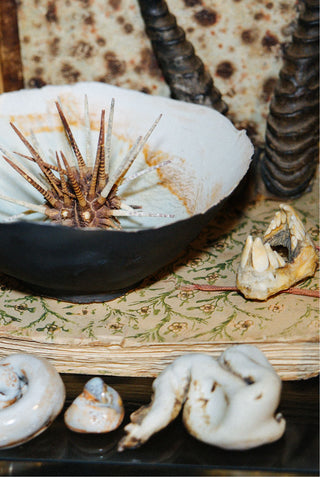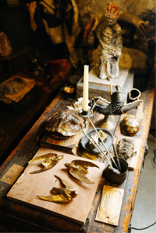 A ritual that I have come to rely on is my walk home after I take my daughter to school through the top of Central Park with my dog, a fierce little bonsai wolf. By the time I’m back at the studio my mind has become mostly clear. The walk is a transition into focus. I find it helpful to pick up where I left off the day before; this way the work feels continuous, like I’m stepping back into a space that has been quietly breathing on its own. My studio is layered with treasures and junk, piles of xeroxed images, books, incense, matchbooks from travels, teeth, knotted branches, shredded fabric scraps, each thing a relic, an accumulation of inspiration and memory.