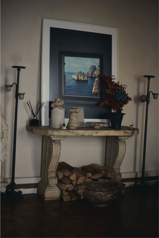 During the course of the afternoon, Gladys (above right) and Isabelle (above left) go on a conversational global tour. They stop at Chatsworth House in England [“I love the English countryside”, says Isabelle], the Teshima Art Museum in Japan [“You leave this place with a smile on your face and stars in your eyes,” says Gladys] via Casa Malaparte in Capri. The latter is captured in a Halard photograph which is propped around three Roman fragments sitting on a side table made of a Roman top and Neoclassical marble legs in Gladys’s front room. It captures a view through a window, a dreamy portal into the Mediterranean. Both women stand in front of it and talk about holidays, swimming and art – and so we begin.